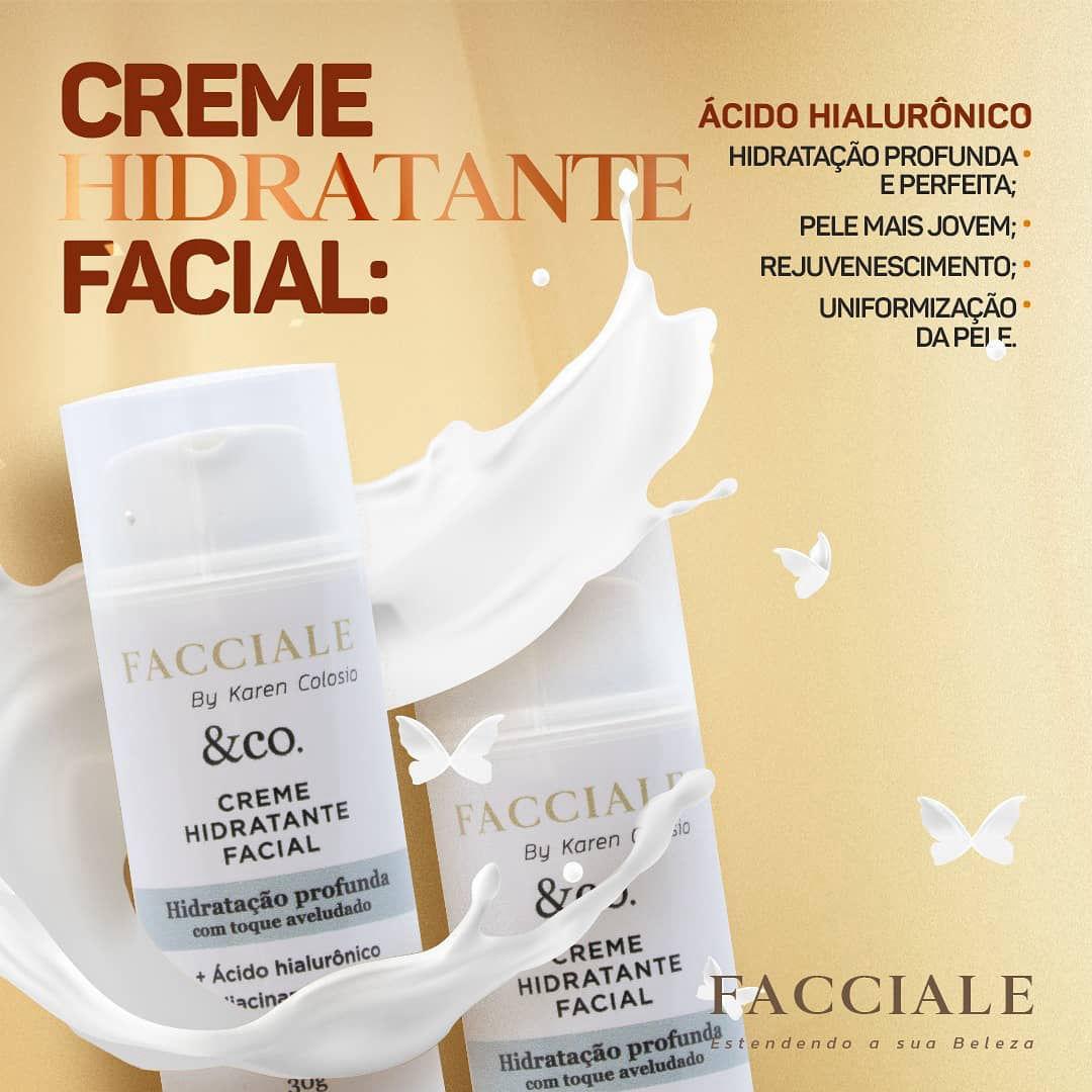 O Creme Hidratante Facial da FACCIALE contém o famoso Ácido Hialurônico que preenche os espaços entre as células mantendo lisa, elástica e bem hidratada.