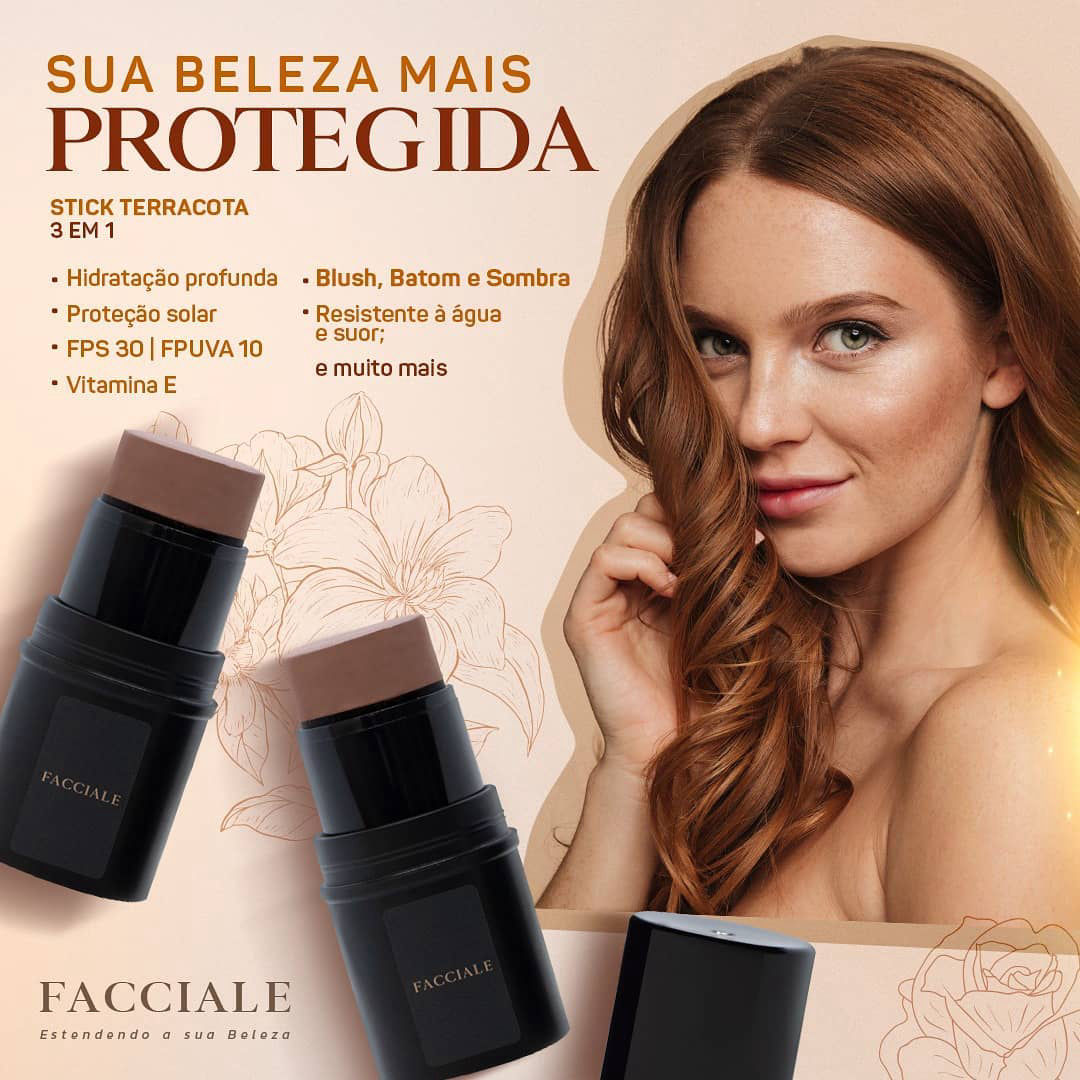 O Stick Terracota da FACCIALE é um produto 3 em 1 (blush, batom e sombra), com fator de proteção solar FPS 30/FPUVA 10. Esse é mais um daqueles produtos que toda mulher precisa ter pois além de rápido e prático é também um multifuncional com sensorial leve e sedoso, ação antioxidante, hidratação profunda, resistente à água e suor...